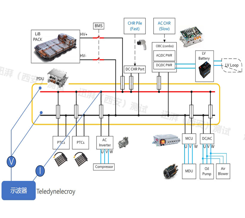 1.Connect the PDU HV high-voltage differential probe to the oscilloscope and connect the current clamp to the high-voltage incoming line